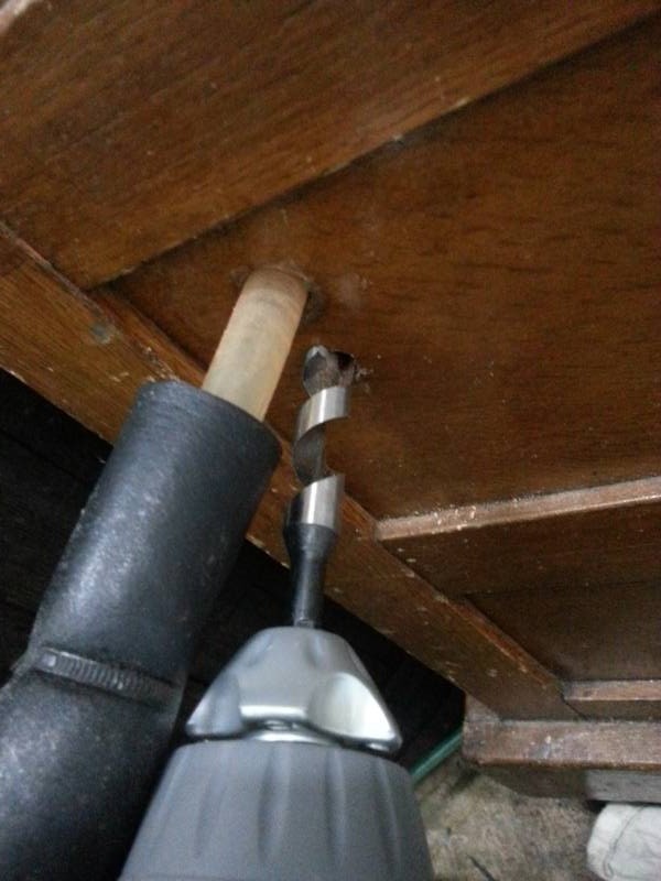 さて その木製冷蔵庫の 裏側の 穴を 少し大きくします