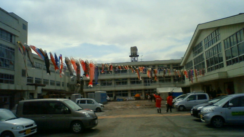 それは、まずは初日の渡波中学校でこいのぼり設置の準備をしている時です。
