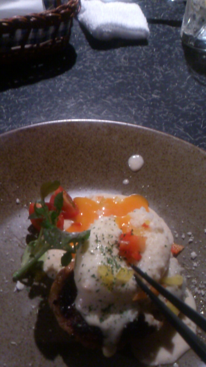 ハンバーグの上に半熟卵がとろ~りと